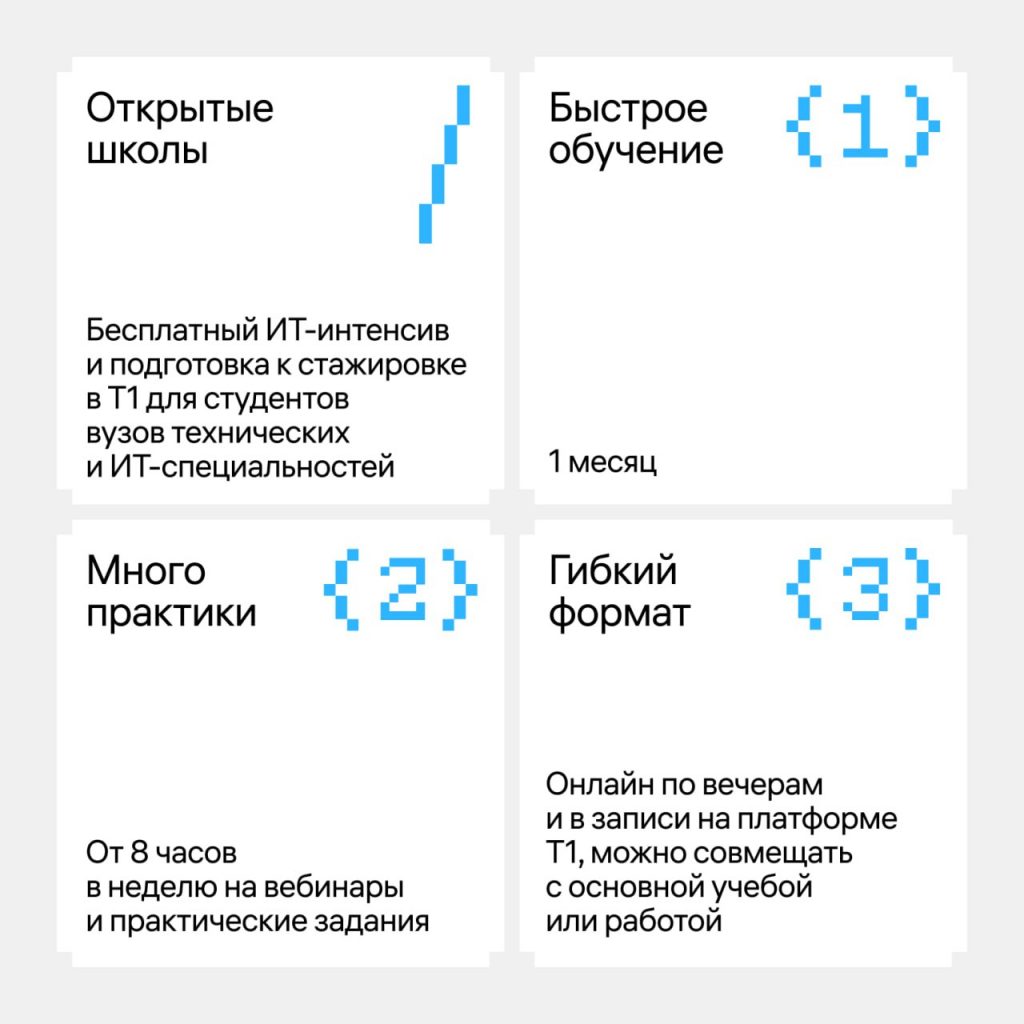ИТ-холдинг Т1 запускает новый поток Открытых школ — это бесплатный онлайн-интенсив для студентов технических и ИТ-направлений со всей России. Опыт работы необязателен — главное знания и желание развиваться в ИТ.