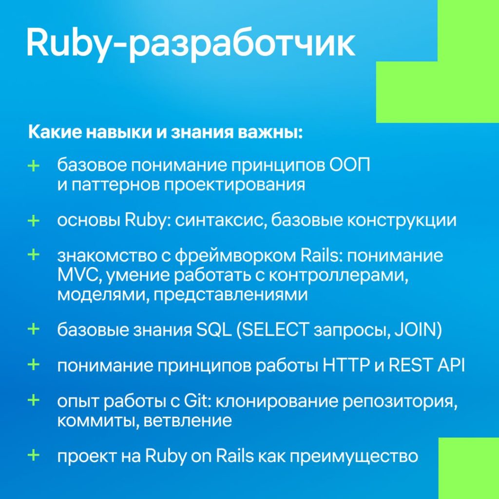 Ты будешь участвовать в развитии централизованной системы управления корпоративными учетными записями (admin directory). Тебе предстоит: изучать существующий код Rails микросервисов, выполнять задачи по доработке функционала, писать код по техническим заданиям и участвовать в код-ревью.